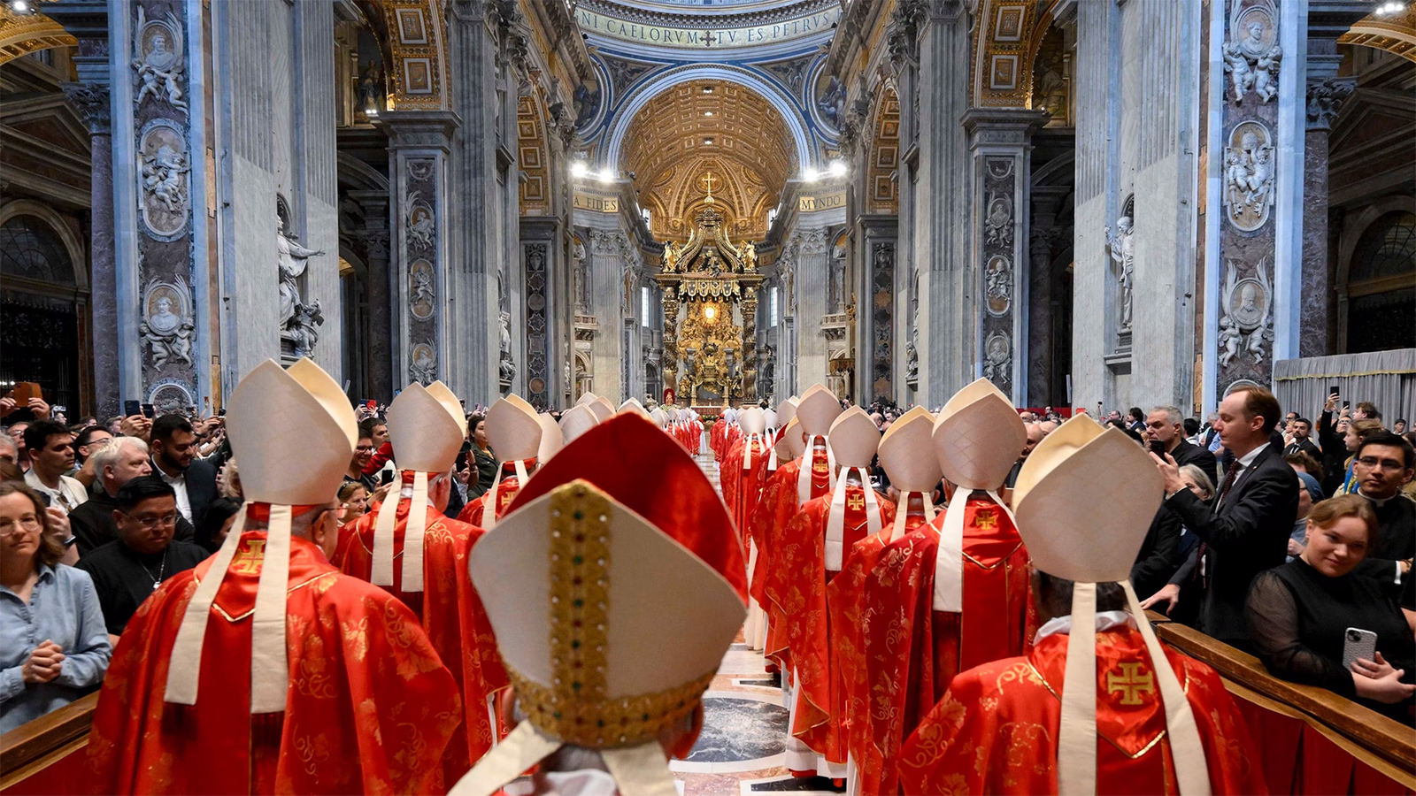Now properly attired, the new pope enters St. Peter’s Basilica for the formal announcement of his election and the revelation of his identity to the world. thousands gather in St. Peter’s Square, eagerly awaiting the news.