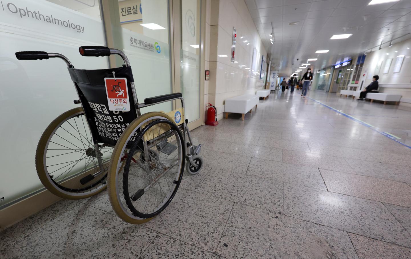 A wheelchair is placed on one side of Chungbuk National University Hospital in Cheongju, Chungbuk on April 5 last year. Chungbuk National university hospital is the only senior general hospital in Chungbuk. Yonhap News