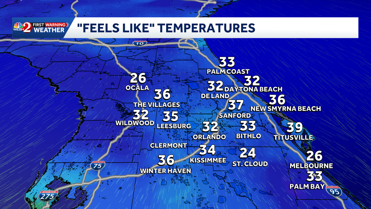A significant drop in temperatures is expected across Central Florida, with wind chills potentially reaching the 20s and highs only in the 40s and 50s.