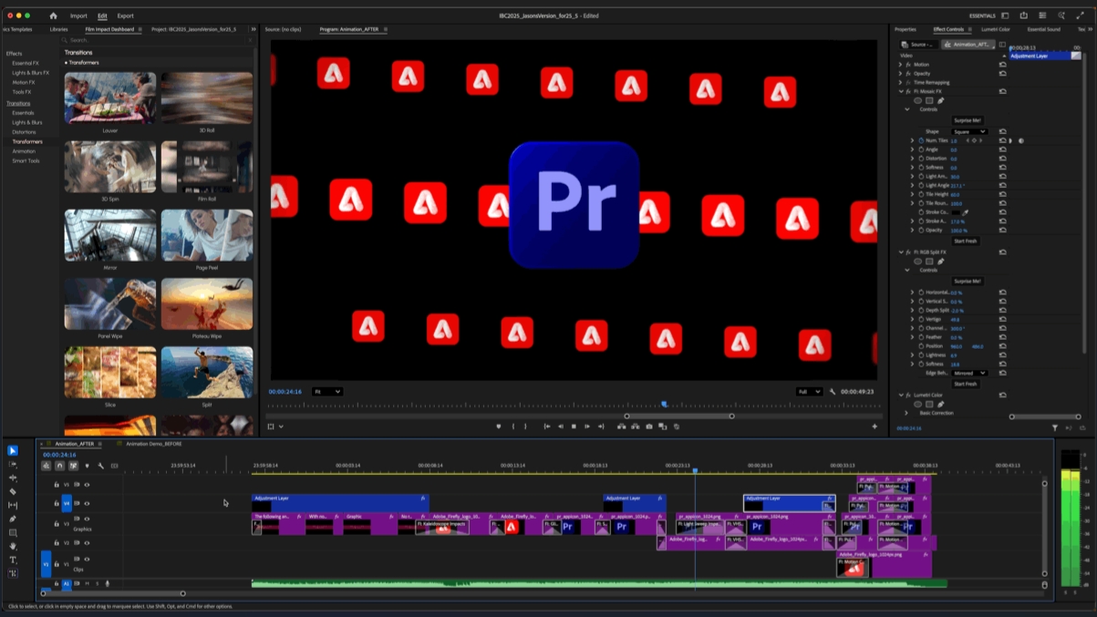 - Motion Graphics within Premiere Pro: Create complex motion graphics without needing After Effects. A new “Surprise Me” button automatically generates effect variations.