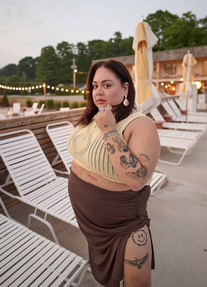 With a high neckline showing off her tattoos, denim shorts, and silver jewellery, she’s serving up a carefree vacation vibe. A light smile graces her lips, and she looks simply radiant in the sunshine!